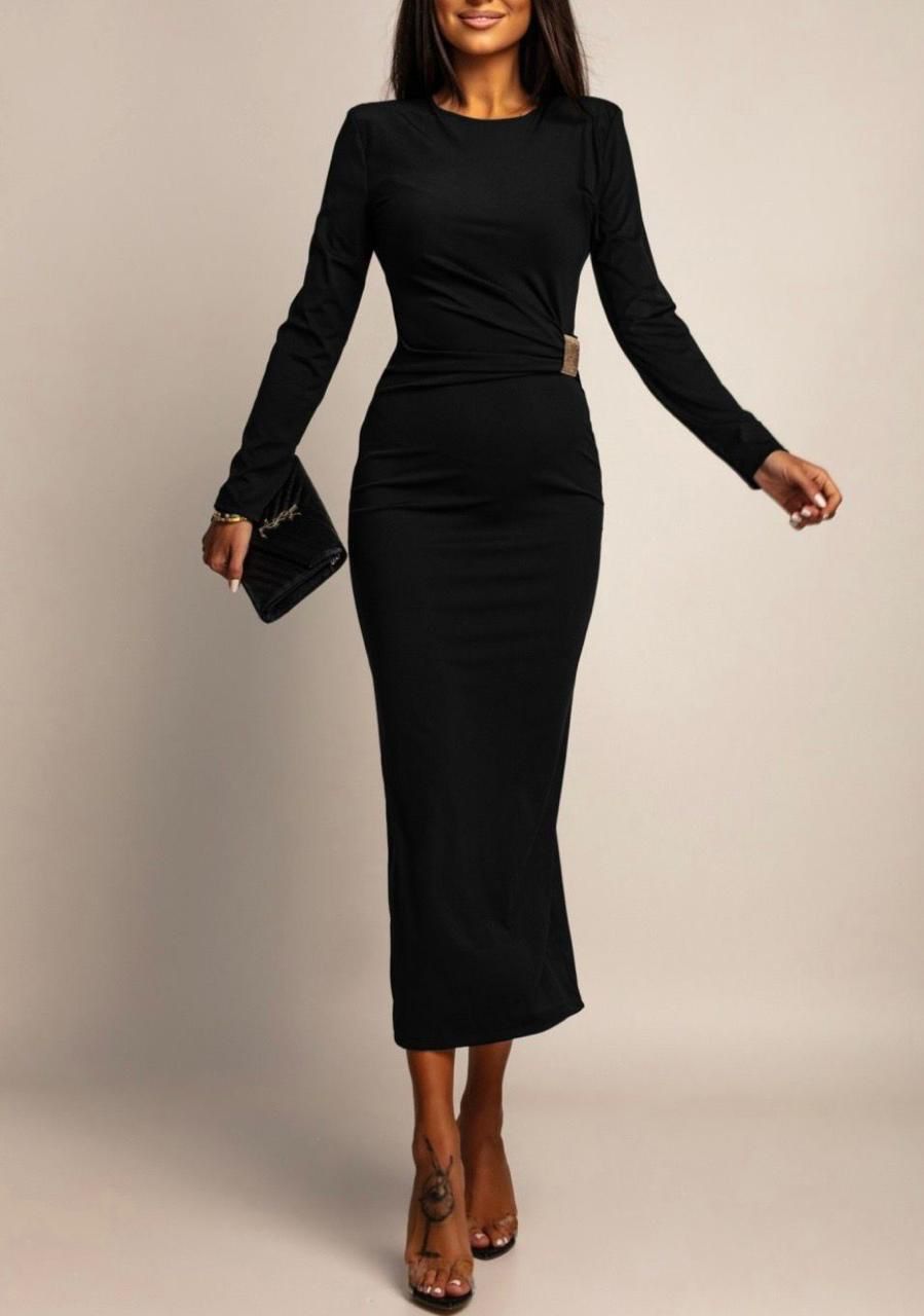 Minimalist, i rafinuar dhe tepër elegant. Ky fustan i zi i gjatë thekson belin me një detaj rrudhimi modern, duke krijuar një formë të bukur dhe të rregullt. Shkon mrekullisht me taka dhe një çantë klasike për pamje chic pa mundim.