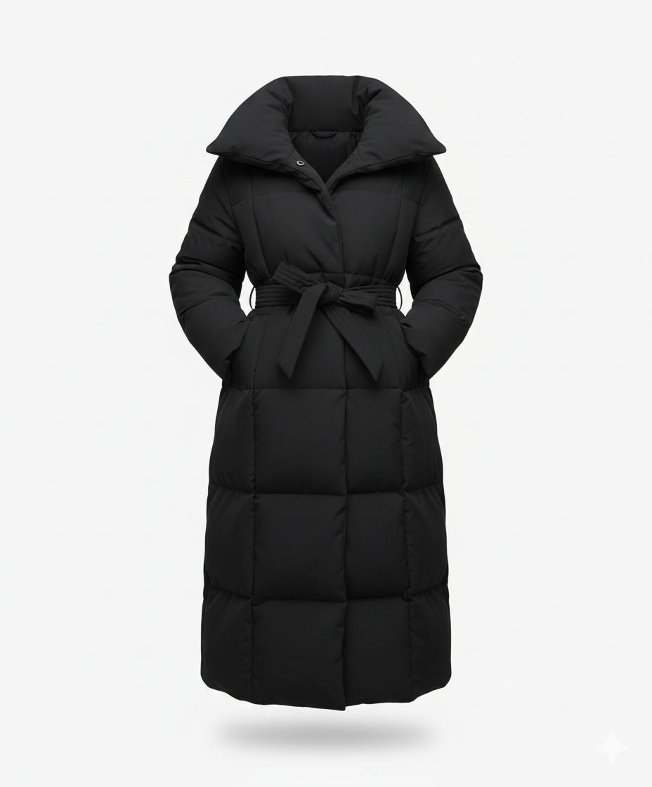 Një pallto e gjatë dhe e fryrë që ndërthur stilin modern me komoditetin maksimal. Ky model vjen me një jakë të lartë dhe voluminoze që ofron mbrojtje nga era, ndërsa rripi në bel thekson siluetën tuaj për një pamje më fine dhe femërore gjatë ditëve të ftohta.