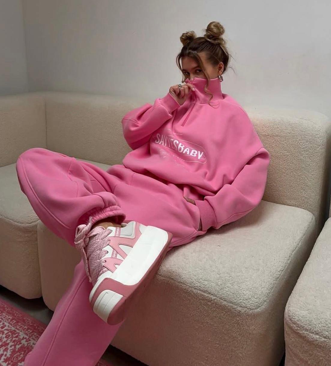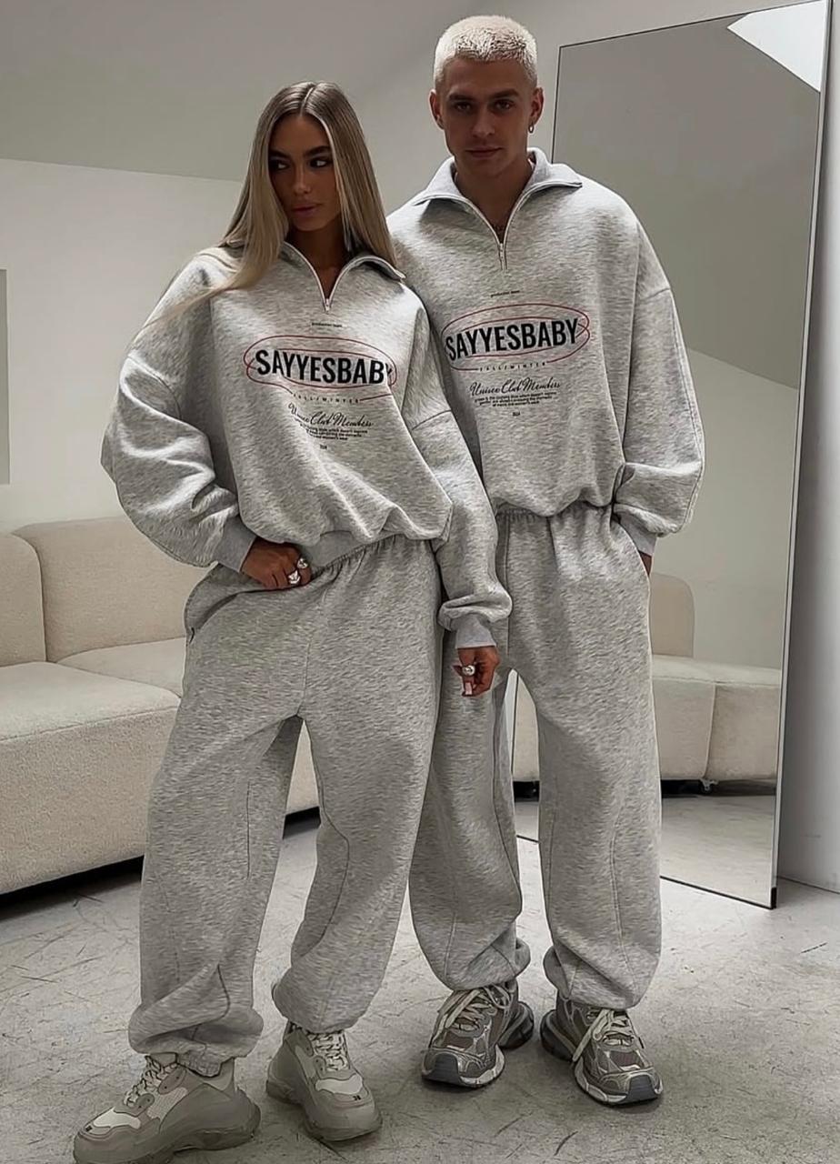Seti “SayYesBaby” është krijuar për ata që duan komoditet maksimal me pamje streetwear. Bluza me jakë të lartë dhe print të qëndrueshëm kombinohet me pantallona të gjera super komode, duke e bërë setin perfekt për të dy — femra dhe meshkuj. I butë, i ngrohtë dhe ideal për veshje të përditshme, palestra të ftohta, udhëtime apo foto look-e në Instagram.