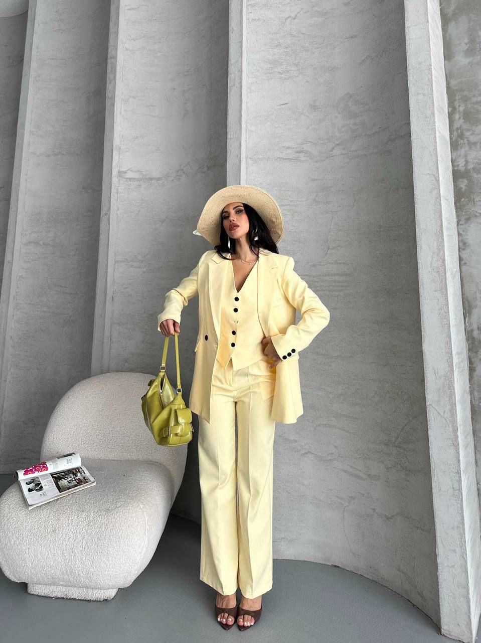 Një set me tre pjesë – xhakete, jelek dhe pantallona – elegant dhe serioz, i përshtatshëm për përdorim të përditshëm dhe punë në zyrë.
